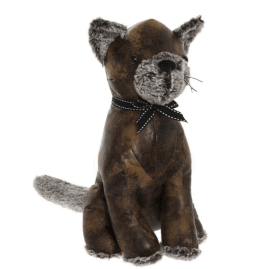 This brown faux leather cat doorstop with faux fur tail and little black bow collar is the puuurfect gift for cat lovers!