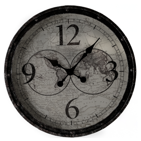 This is the Jensen clock with a distressed metal frame and a map of the world on the face of the clock.