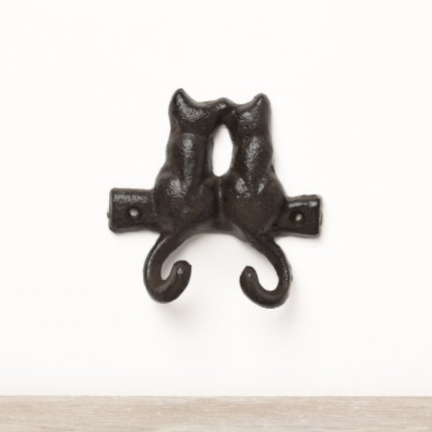 A simplistic cast iron wall hook featuring a pair of cats with their tails as the hooks.