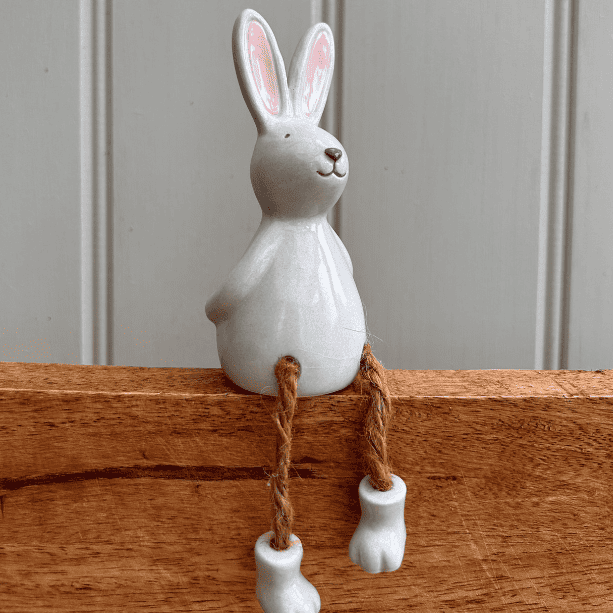 Adorable Porcelain Rabbit, Painted in White and Grey, with Quirky Dangling Legs and Matching Ceramic Feet