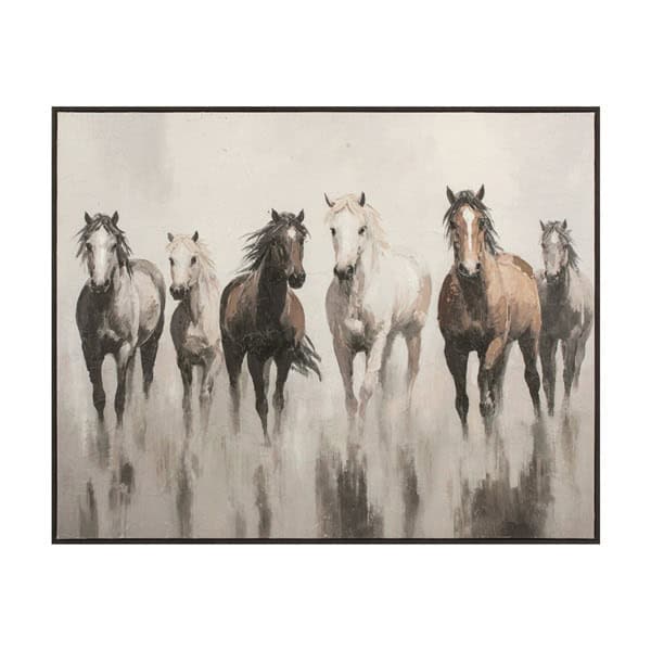 Galloping horses scene canvas finished in a frame. This artwork captures the dynamic motion of horses galloping across a natural landscape.