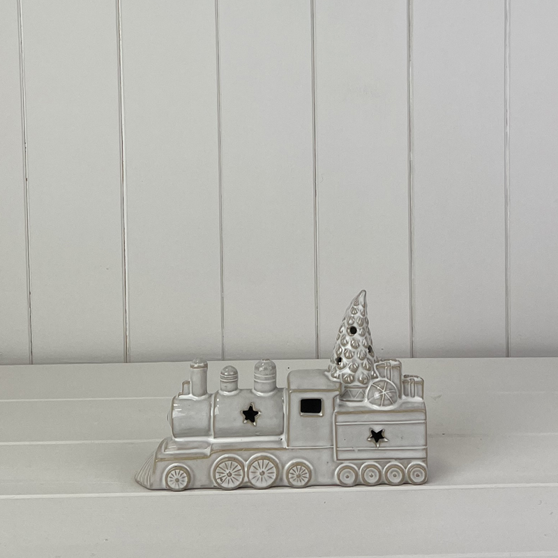 Glazed Ceramic Train Ornament with Textured Detail and LED
