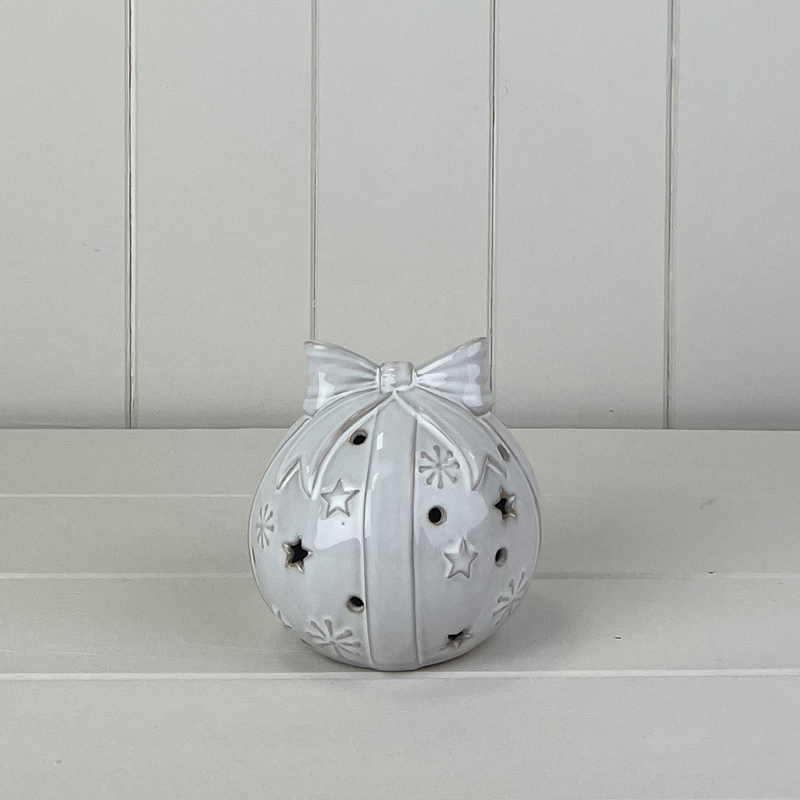 Medium Glazed Ceramic Bauble with Bow Ornament with Textured Detail and LED