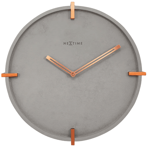 The "Mohawk Wall' is a round wall clock (32 cm) The grey concrete material matches perfectly with the copper elements and is very stylish. The cut-out hands are a special detail. The clock is silent and runs on 1x AA battery (not included).